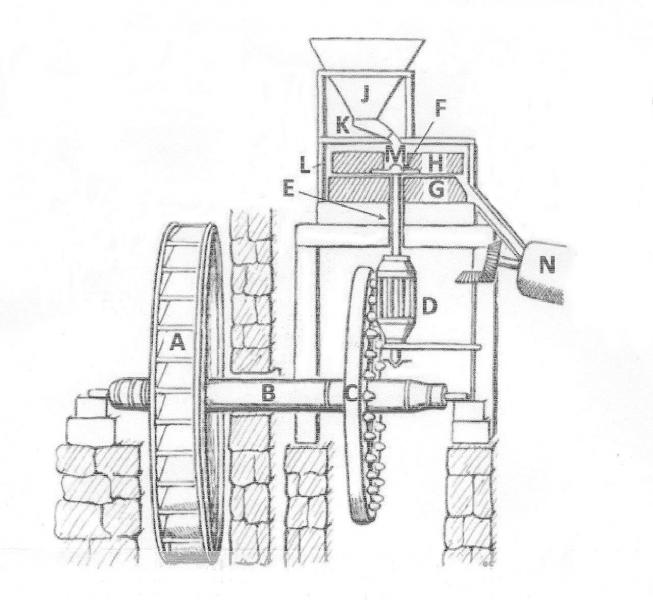 Question N° : 1045 Dans ce schéma sommaire dun mécanisme de moulin, quelle lettre désigne la meule dormante ? |